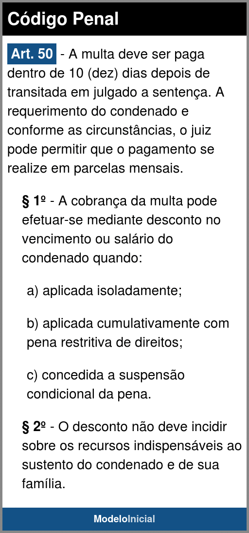 Art. 50 - A multa deve ser paga dentro de 10 (dez) dias depois de transitada em julgado a sentença. A requerimento do condenado e conforme as circunstâncias, o juiz pode permitir que o pagamento se realize em parcelas mensais.