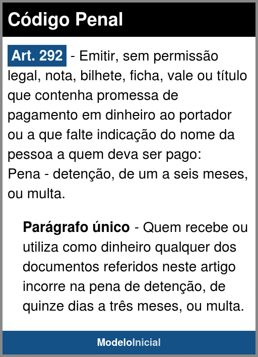 Art. 292 - Emitir, sem permissão legal, nota, bilhete, ficha, vale ou título que contenha promessa de pagamento em dinheiro ao portador ou a que falte indicação do nome da pessoa a quem deva ser pago:Pena - detenção, de um a seis meses, ou multa.