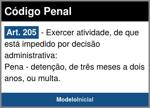 Art. 205 - Exercer atividade, de que está impedido por decisão administrativa:Pena - detenção, de três meses a dois anos, ou multa.