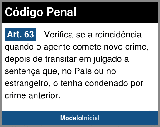 Art. 63 - Verifica-se a reincidência quando o agente comete novo crime, depois de transitar em julgado a sentença que, no País ou no estrangeiro, o tenha condenado por crime anterior.