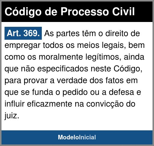 Art. 369. As partes têm o direito de empregar todos os meios legais, bem como os moralmente legítimos, ainda que não especificados neste Código, para provar a verdade dos fatos em que se funda o pedido ou a defesa e influir eficazmente na convicção do juiz.