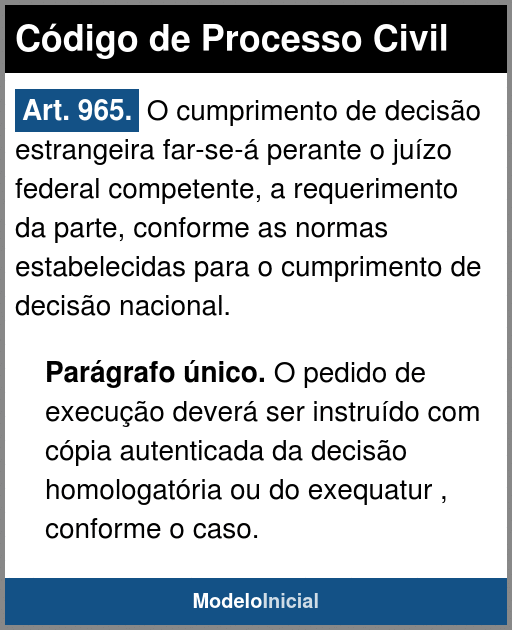 Art. 965. O cumprimento de decisão estrangeira far-se-á perante o juízo federal competente, a requerimento da parte, conforme as normas estabelecidas para o cumprimento de decisão nacional.