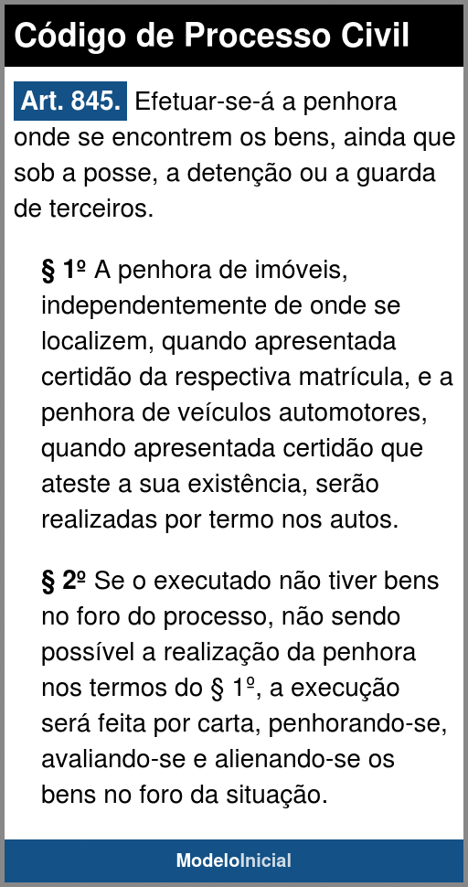 Art. 845. Efetuar-se-á a penhora onde se encontrem os bens, ainda que sob a posse, a detenção ou a guarda de terceiros.