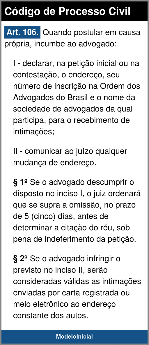 Observar o Art. 106 do Novo CPC: Quando postular em causa própria, incumbe ao advogado: I - declarar, na petição inicial ou na contestação, o endereço, seu número de inscrição na Ordem dos Advogados do Brasil e o nome da sociedade de advogados da qual participa, para o recebimento de intimações; II - comunicar ao juízo qualquer mudança de endereço. Atentar às incompatibilidades do exercício da Advocacia, mesmo em causa própria, com as atividades previstas no Art. 28 da Lei 8.906/94.