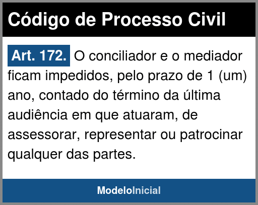 Art. 172. O conciliador e o mediador ficam impedidos, pelo prazo de 1 (um) ano, contado do término da última audiência em que atuaram, de assessorar, representar ou patrocinar qualquer das partes.