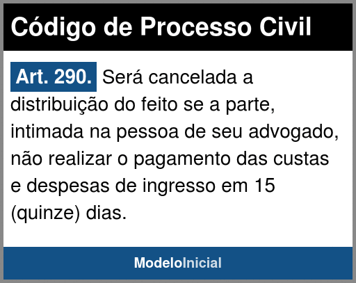 Art. 290. Será cancelada a distribuição do feito se a parte, intimada na pessoa de seu advogado, não realizar o pagamento das custas e despesas de ingresso em 15 (quinze) dias.