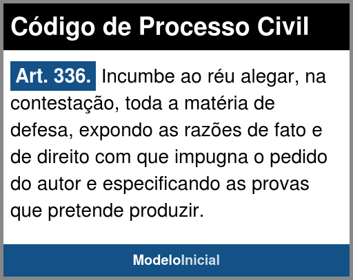 Art. 336. Incumbe ao réu alegar, na contestação, toda a matéria de defesa, expondo as razões de fato e de direito com que impugna o pedido do autor e especificando as provas que pretende produzir.