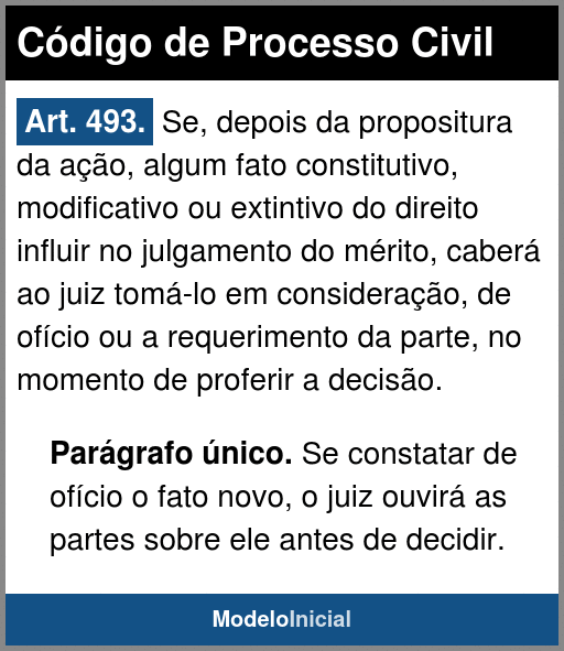 Art. 493. Se, depois da propositura da ação, algum fato constitutivo, modificativo ou extintivo do direito influir no julgamento do mérito, caberá ao juiz tomá-lo em consideração, de ofício ou a requerimento da parte, no momento de proferir a decisão.