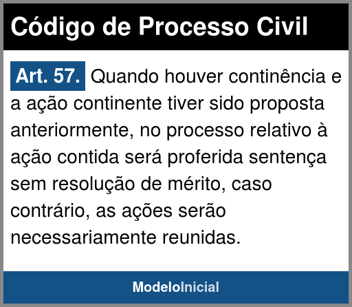Art. 57. Quando houver continência e a ação continente tiver sido proposta anteriormente, no processo relativo à ação contida será proferida sentença sem resolução de mérito, caso contrário, as ações serão necessariamente reunidas.