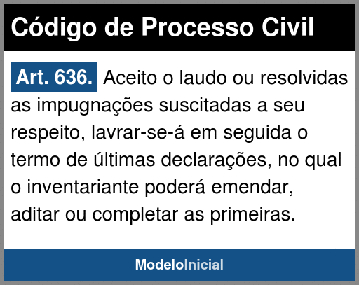 Art. 636. Aceito o laudo ou resolvidas as impugnações suscitadas a seu respeito, lavrar-se-á em seguida o termo de últimas declarações, no qual o inventariante poderá emendar, aditar ou completar as primeiras.
