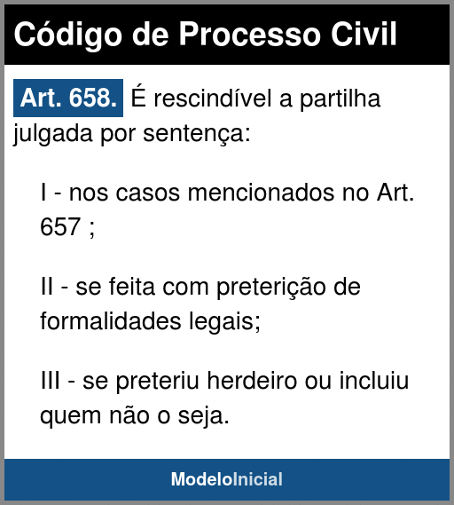 CABIMENTO: Ação cabível em face de defeitos e vícios que invalidam o negócio jurídico (Art. 2.027, 166 e 171 do CC e 657 do CPC/15), quais sejam: incapacidade, objeto ilícito (art. 166 CC), coação (Art. 151 CC), dolo (Art. 145 CC), erro (Art. 138 CC), estado de perigo (Art. 156 CC), lesão (Art. 157 CC), fraude contra credores (Art. 158 CC), simulação (Art. 167 CC). Obs.1: Quando o vício for processual (partilha julgada por sentença), deve ser utilizada a via rescisória (Art. 658 CPC/15). (Vide NERY JUNIOR, Nelson. NERY, Rosa Maria de Andrade. Código Civil Comentado. 12 ed. Editora RT, 2017. Versão ebook, Art. 2.027) Obs.2: Para os casos em que o herdeiro demandar o reconhecimento de seu direito sucessório, para obter a restituição da herança, ou de parte dela, cabe ação de petição de herança. (Art. 1.824 CC) Obs.3: Para os casos em que houver a necessidade complementação ou correção dos bens inventariados, cabe a sobrepartilha em alegações finais de inventário. (Art. 636 CPC) DECADÊNCIA: Extingue-se em um ano o direito de anular a partilha. (Parágrafo único, Art. 2.027 CC e Art. 657, parágrafo único). Alguns casos de nulidade de maior gravidade, entende-se que o prazo é o decenal (Art. 205 CC - STJ AREsp 226.991/SP)