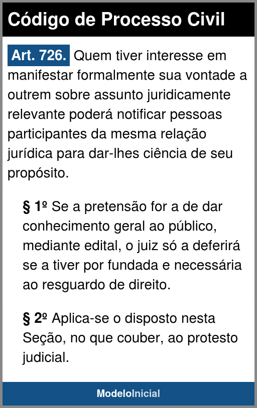 Art. 726. Quem tiver interesse em manifestar formalmente sua vontade a outrem sobre assunto juridicamente relevante poderá notificar pessoas participantes da mesma relação jurídica para dar-lhes ciência de seu propósito.