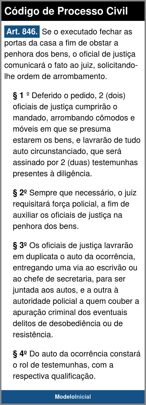 Art. 846. Se o executado fechar as portas da casa a fim de obstar a penhora dos bens, o oficial de justiça comunicará o fato ao juiz, solicitando-lhe ordem de arrombamento.