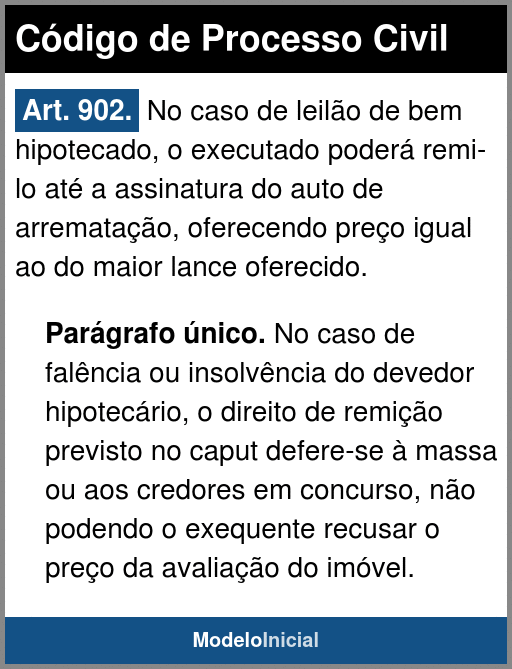 Art. 902. No caso de leilão de bem hipotecado, o executado poderá remi-lo até a assinatura do auto de arrematação, oferecendo preço igual ao do maior lance oferecido.