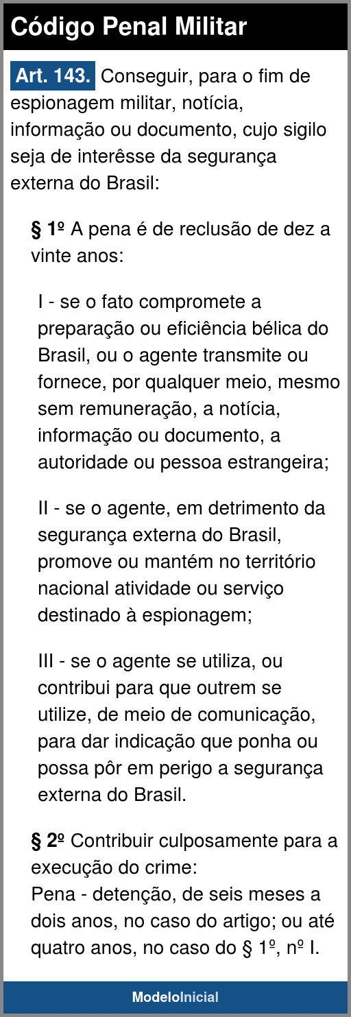 Art. 143. Conseguir, para o fim de espionagem militar, notícia, informação ou documento, cujo sigilo seja de interêsse da segurança externa do Brasil:Pena - reclusão, de quatro a doze anos.