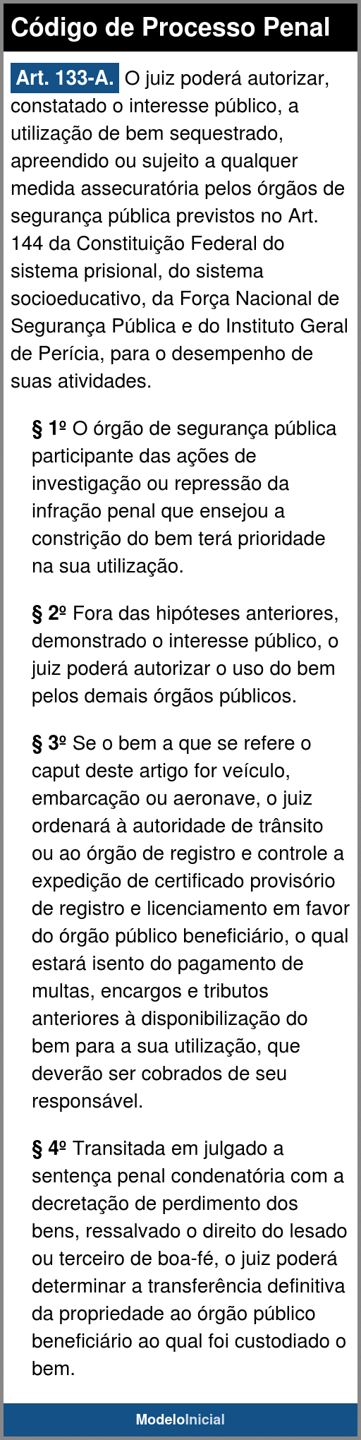 Art. 133-A. O juiz poderá autorizar, constatado o interesse público, a utilização de bem sequestrado, apreendido ou sujeito a qualquer medida assecuratória pelos órgãos de segurança pública previstos no Art. 144 da Constituição Federal do sistema prisional, do sistema socioeducativo, da Força Nacional de Segurança Pública e do Instituto Geral de Perícia, para o desempenho de suas atividades.
