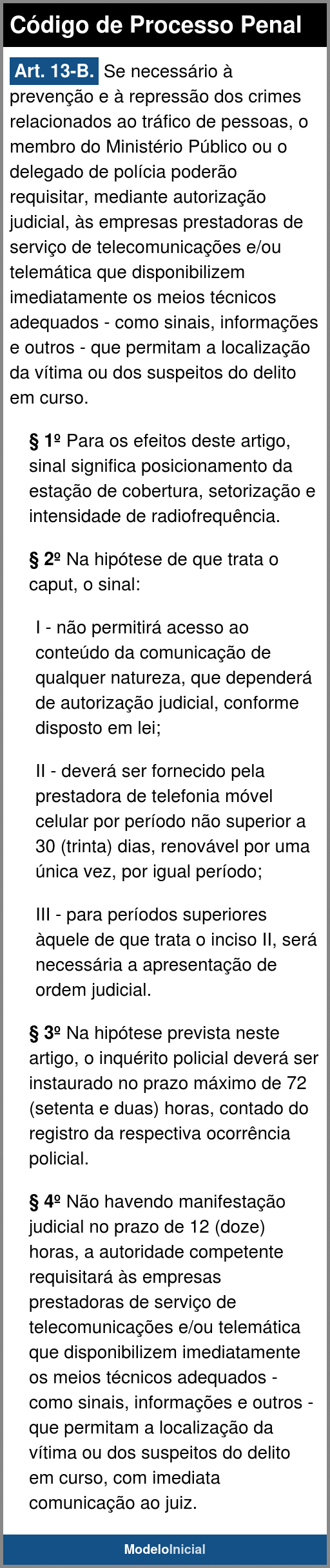 Art. 13-B. Se necessário à prevenção e à repressão dos crimes relacionados ao tráfico de pessoas, o membro do Ministério Público ou o delegado de polícia poderão requisitar, mediante autorização judicial, às empresas prestadoras de serviço de telecomunicações e/ou telemática que disponibilizem imediatamente os meios técnicos adequados - como sinais, informações e outros - que permitam a localização da vítima ou dos suspeitos do delito em curso.