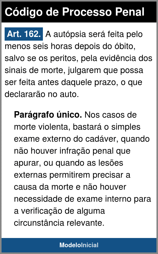 Art. 162. A autópsia será feita pelo menos seis horas depois do óbito, salvo se os peritos, pela evidência dos sinais de morte, julgarem que possa ser feita antes daquele prazo, o que declararão no auto.