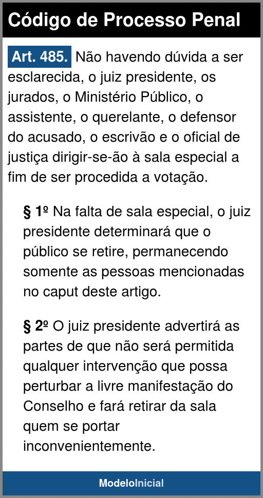 Art. 485. Não havendo dúvida a ser esclarecida, o juiz presidente, os jurados, o Ministério Público, o assistente, o querelante, o defensor do acusado, o escrivão e o oficial de justiça dirigir-se-ão à sala especial a fim de ser procedida a votação.