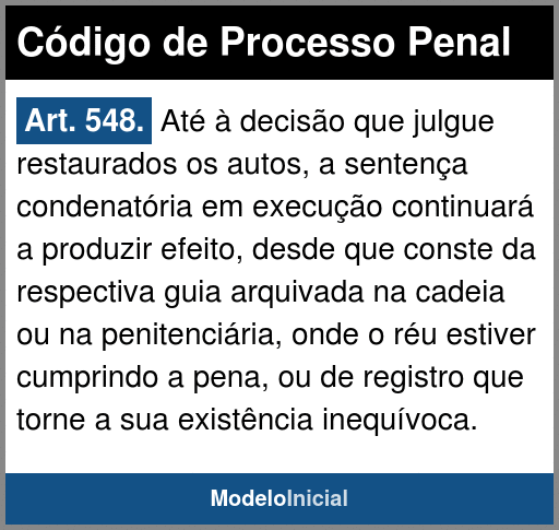 Art. 548. Até à decisão que julgue restaurados os autos, a sentença condenatória em execução continuará a produzir efeito, desde que conste da respectiva guia arquivada na cadeia ou na penitenciária, onde o réu estiver cumprindo a pena, ou de registro que torne a sua existência inequívoca.