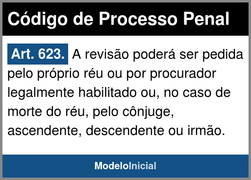 Art. 623. A revisão poderá ser pedida pelo próprio réu ou por procurador legalmente habilitado ou, no caso de morte do réu, pelo cônjuge, ascendente, descendente ou irmão.
