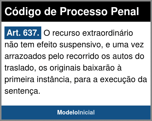 Art. 637. O recurso extraordinário não tem efeito suspensivo, e uma vez arrazoados pelo recorrido os autos do traslado, os originais baixarão à primeira instância, para a execução da sentença.