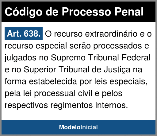 Art. 638. O recurso extraordinário e o recurso especial serão processados e julgados no Supremo Tribunal Federal e no Superior Tribunal de Justiça na forma estabelecida por leis especiais, pela lei processual civil e pelos respectivos regimentos internos.