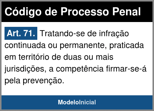 Art. 71. Tratando-se de infração continuada ou permanente, praticada em território de duas ou mais jurisdições, a competência firmar-se-á pela prevenção.