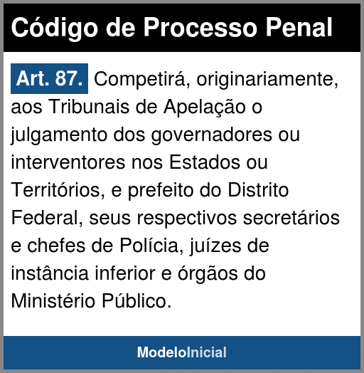 Art. 87. Competirá, originariamente, aos Tribunais de Apelação o julgamento dos governadores ou interventores nos Estados ou Territórios, e prefeito do Distrito Federal, seus respectivos secretários e chefes de Polícia, juízes de instância inferior e órgãos do Ministério Público.