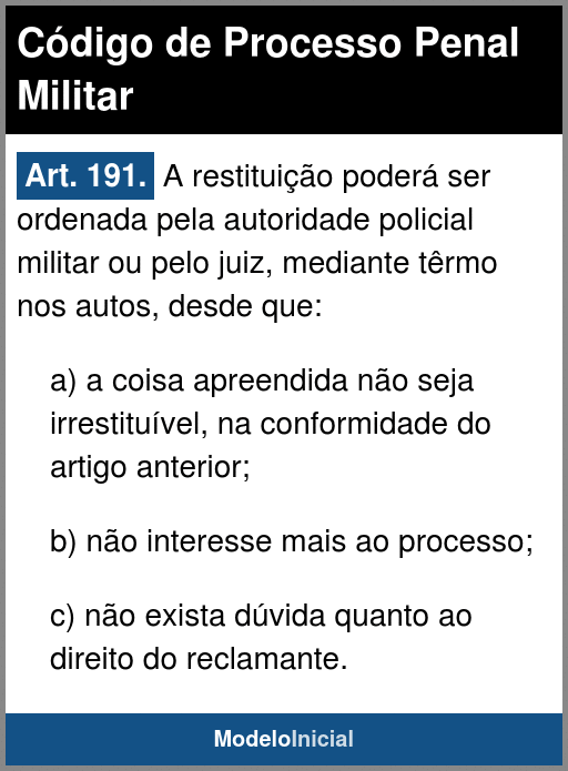 Art. 191. A restituição poderá ser ordenada pela autoridade policial militar ou pelo juiz, mediante têrmo nos autos, desde que: