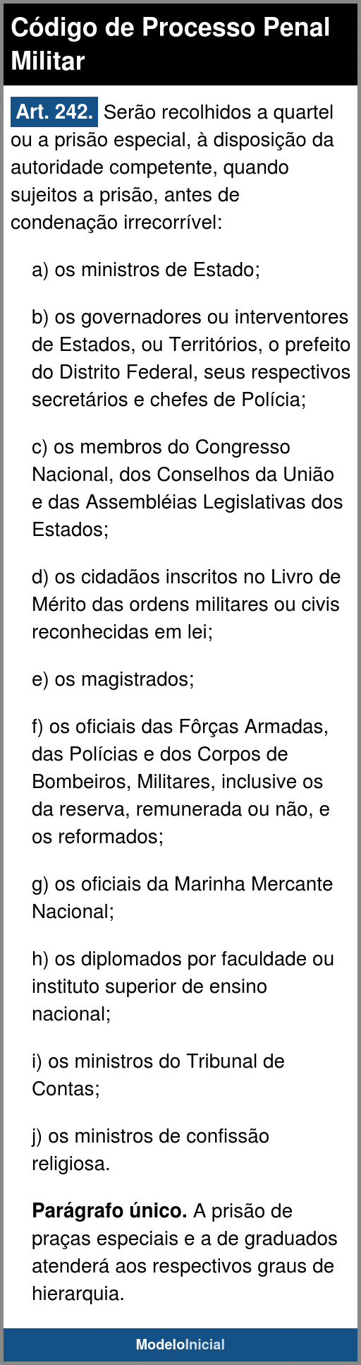 Art. 242. Serão recolhidos a quartel ou a prisão especial, à disposição da autoridade competente, quando sujeitos a prisão, antes de condenação irrecorrível: