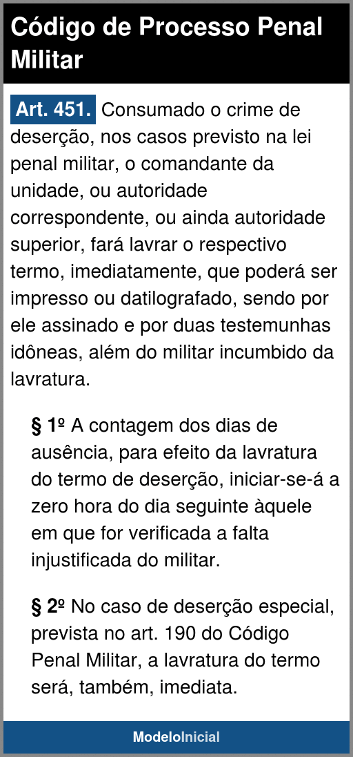 Art. 451. Consumado o crime de deserção, nos casos previsto na lei penal militar, o comandante da unidade, ou autoridade correspondente, ou ainda autoridade superior, fará lavrar o respectivo termo, imediatamente, que poderá ser impresso ou datilografado, sendo por ele assinado e por duas testemunhas idôneas, além do militar incumbido da lavratura.