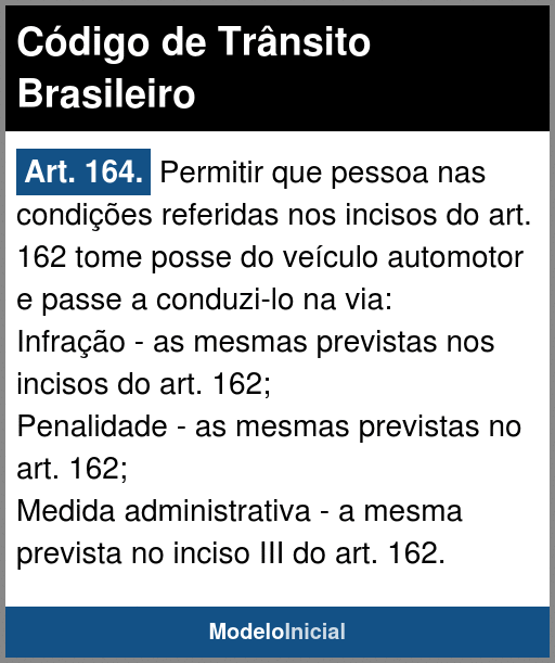 Art. 164. Permitir que pessoa nas condições referidas nos incisos do art. 162 tome posse do veículo automotor e passe a conduzi-lo na via: