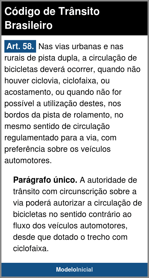 Art. 58. Nas vias urbanas e nas rurais de pista dupla, a circulação de bicicletas deverá ocorrer, quando não houver ciclovia, ciclofaixa, ou acostamento, ou quando não for possível a utilização destes, nos bordos da pista de rolamento, no mesmo sentido de circulação regulamentado para a via, com preferência sobre os veículos automotores.