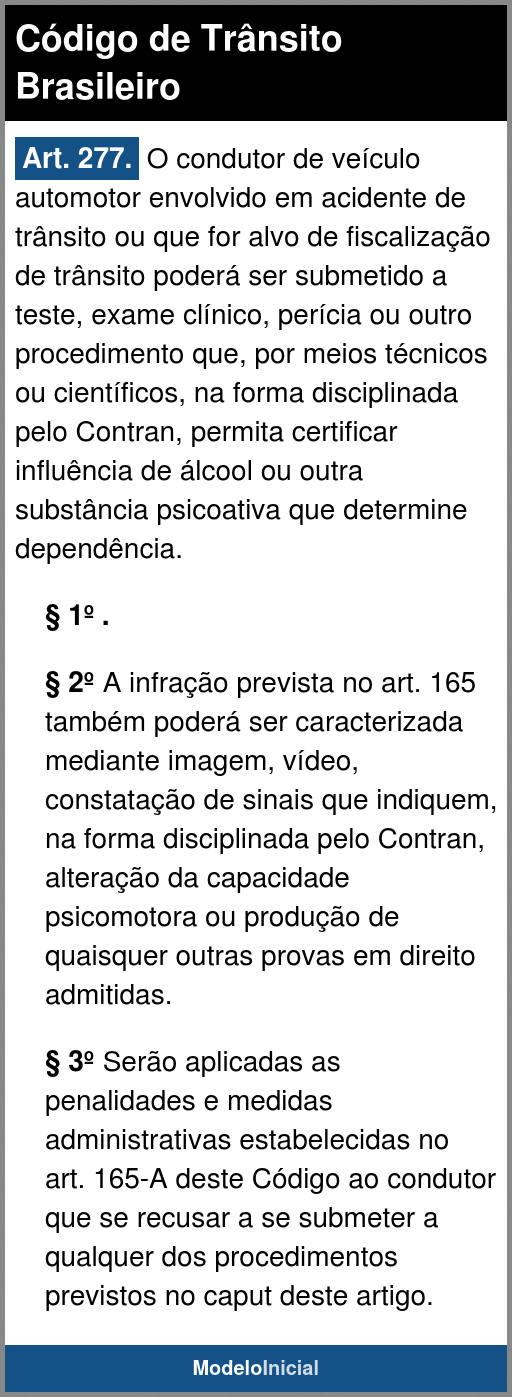 Art. 277. O condutor de veículo automotor envolvido em sinistro de trânsito ou que for alvo de fiscalização de trânsito poderá ser submetido a teste, exame clínico, perícia ou outro procedimento que, por meios técnicos ou científicos, na forma disciplinada pelo Contran, permita certificar influência de álcool ou outra substância psicoativa que determine dependência.
