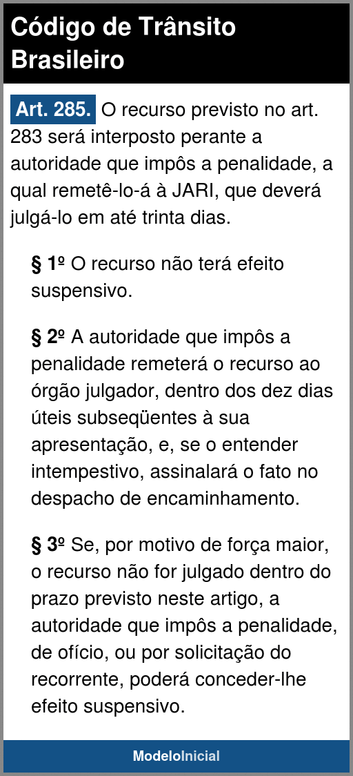 Art. 285. O recurso contra a penalidade imposta nos termos do art. 282 deste Código será interposto perante a autoridade que imputou a penalidade e terá efeito suspensivo.