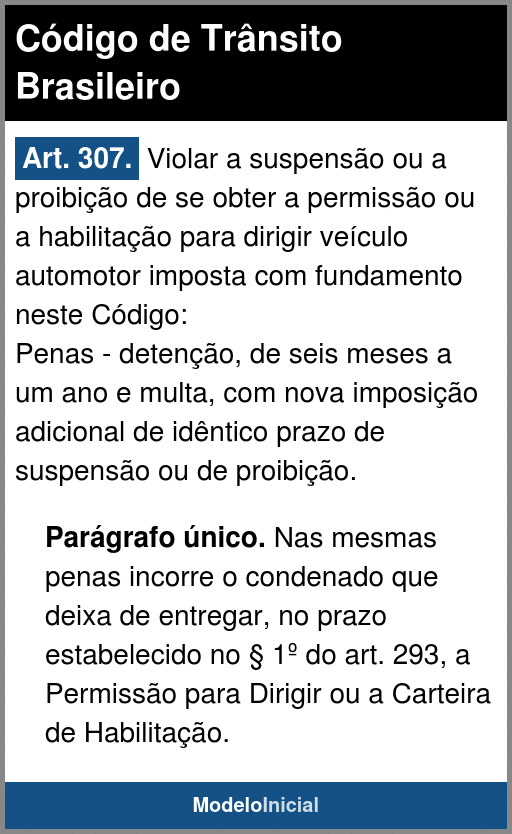 Art. 307. Violar a suspensão ou a proibição de se obter a permissão ou a habilitação para dirigir veículo automotor imposta com fundamento neste Código: