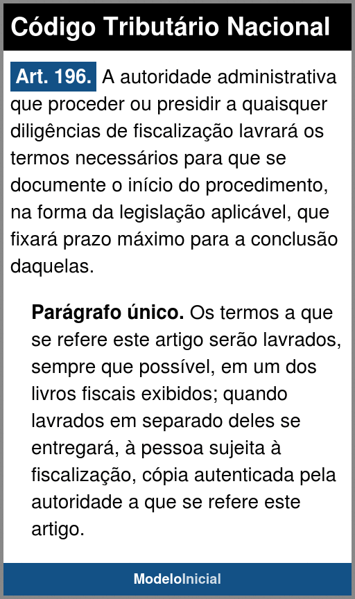 Art. 196. A autoridade administrativa que proceder ou presidir a quaisquer diligências de fiscalização lavrará os têrmos necessários para que se documente o início do procedimento, na forma da legislação aplicável, que fixará prazo máximo para a conclusão daquelas.