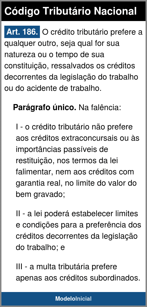 Art. 186. O crédito tributário prefere a qualquer outro, seja qual for sua natureza ou o tempo de sua constituição, ressalvados os créditos decorrentes da legislação do trabalho ou do acidente de trabalho.