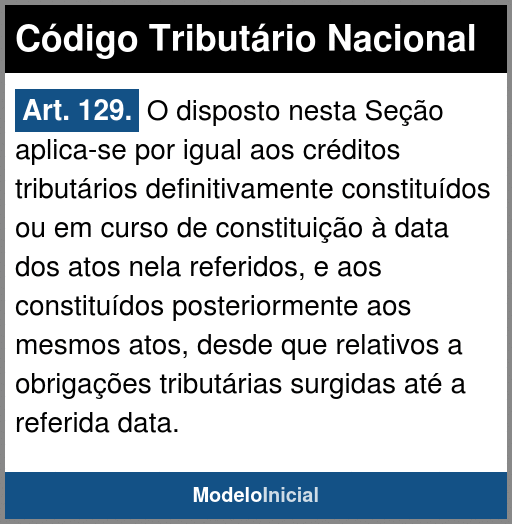 Art. 129. O disposto nesta Seção aplica-se por igual aos créditos tributários definitivamente constituídos ou em curso de constituição à data dos atos nela referidos, e aos constituídos posteriormente aos mesmos atos, desde que relativos a obrigações tributárias surgidas até a referida data.