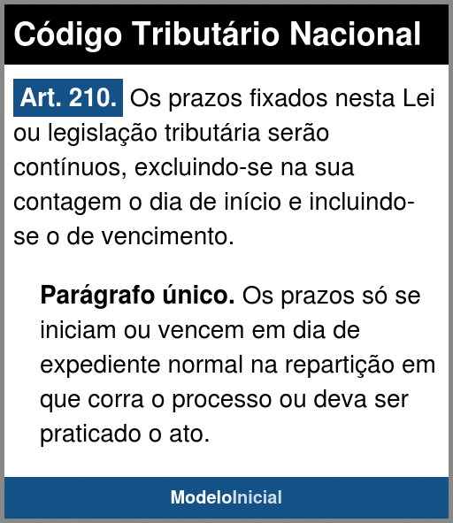 Art. 210. Os prazos fixados nesta Lei ou legislação tributária serão contínuos, excluindo-se na sua contagem o dia de início e incluindo-se o de vencimento.