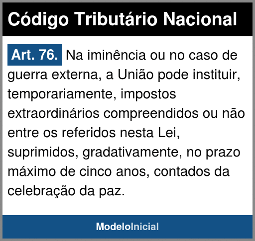 Art. 76. Na iminência ou no caso de guerra externa, a União pode instituir, temporariamente, impostos extraordinários compreendidos ou não entre os referidos nesta Lei, suprimidos, gradativamente, no prazo máximo de cinco anos, contados da celebração da paz.