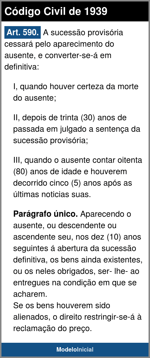 Art. 590. A sucessão provisória cessará pelo aparecimento do ausente, e converter-se-á em definitiva: