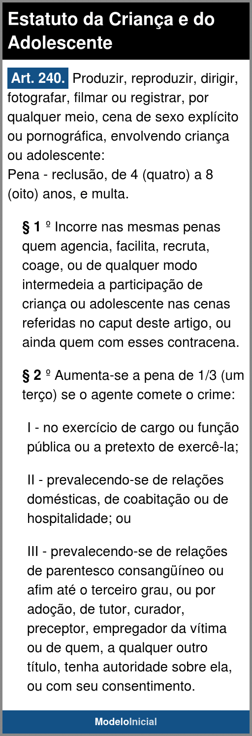 Art. 240. Produzir, reproduzir, dirigir, fotografar, filmar ou registrar, por qualquer meio, cena de sexo explícito ou pornográfica, envolvendo criança ou adolescente:
