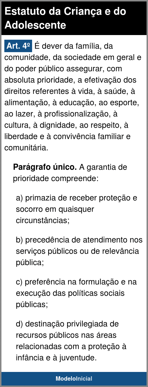 Art. 4º É dever da família, da comunidade, da sociedade em geral e do poder público assegurar, com absoluta prioridade, a efetivação dos direitos referentes à vida, à saúde, à alimentação, à educação, ao esporte, ao lazer, à profissionalização, à cultura, à dignidade, ao respeito, à liberdade e à convivência familiar e comunitária.
