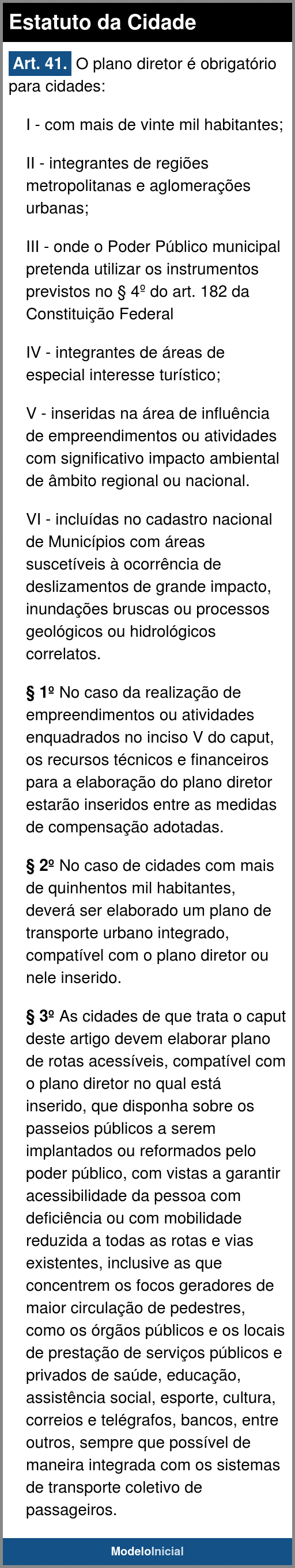 ...PÚBLICO DE MINAS GERAIS PARA CONDENÁ-LO A ELABORAR E SUBMETER, POR MEIO DE SEU PODER EXECUTIVO, À APRECIAÇÃO DA CÂMARA MUNICIPAL, NO PRAZO DE 180 DIAS, PROJETO DE LEI CONTENDO O PLANO DIRETOR MUNICIPAL. II. QUESTÃO EM DISCUSSÃO 2. A QUESTÃO EM DISCUSSÃO CONSISTE EM VERIFICAR SE O MUNICÍPIO DE BAEPENDI, MESMO POSSUINDO MENOS DE 20 MIL HABITANTES, ESTÁ OBRIGADO A ELABORAR PLANO DIRETOR MUNICIPAL, POR SER CLASSIFICADO COMO INTEGRANTE DE ÁREA DE ESPECIAL INTERESSE TURÍSTICO, NOS TERMOS DO ART. 41, IV, DO ESTATUTO DA CIDADE. III. RAZÕES DE DECIDIR 3. O PLANO DIRETOR É OBRIGATÓRIO PARA MUNICÍPIOS QUE, EMBORA NÃO TENHAM MAIS DE 20 MIL HABITANTES, ESTEJAM INSERIDOS EM ÁREAS DE ESPECIAL INTERESSE TURÍSTICO, NOS TERMOS DO ART. 41, IV, DA LEI Nº 10.257/2001. 4. A EMBRATUR RECONHECE FORMALMENTE O MUNICÍPIO DE BAEPENDI COMO DETENTOR DE POTENCIAL TURÍSTICO, TENDO-O INCLUÍDO ENTRE OS MUNICÍPIOS COM POTENCIAL TURÍSTICO (MPT), EM RAZÃO DE SUAS RIQUEZAS NATURAIS, HISTÓRICAS, CULTURAIS E RELIGIOSAS. 5. A CLASSIFICAÇÃO COMO ÁREA DE ESPECIAL INTERESSE TURÍSTICO IMPÕE AO MUNICÍPIO O DEVER DE ELABORAR PLANO DIRETOR, MESMO QUE NÃO ATINJA O CRITÉRIO POPULACIONAL DO INCISO I DO ART. 41, DADO O IMPACTO DO TURISMO SOBRE O ORDENAMENTO URBANO E OS SERVIÇOS PÚBLICOS. 6. O PLANO DIRETOR É INSTRUMENTO ESSENCIAL DE PLANEJAMENTO URBANO E PROTEÇÃO DO MEIO AMBIENTE, DA FUNÇÃO SOCIAL DA CIDADE E DO PATRIMÔNIO CULTURAL, NÃO SE RESTRINGINDO À REGULARIZAÇÃO DO PASSADO, MAS SENDOFERRAMENTA ESTRATÉGICA PARA O FUTURO URBANO SUSTENTÁVEL. 7. A ALEGAÇÃO DE IMUTABILIDADE DO TECIDO URBANO E CONSOLIDAÇÃO HISTÓRICA NÃO EXIME O MUNICÍPIO DO CUMPRIMENTO DO DEVER CONSTITUCIONAL E LEGAL DE PLANEJAMENTO. 8. A OMISSÃO DO PODER PÚBLICO EM ELABORAR O PLANO DIRETOR COMPROMETE A EFETIVIDADE DE DIREITOS FUNDAMENTAIS PREVISTOS NA CONSTITUIÇÃO, COMO O DIREITO AO MEIO AMBIENTE EQUILIBRADO, À MORADIA, À CIDADE SUSTENTÁVEL E À EFICIÊNCIA ADMINISTRATIVA. IV. DISPOSITIVO E TESE 9. RECURSO DESPROVIDO. TESE DE JULGAMENTO: 1. A OBRIGATORIEDADE DE ELABORAÇÃO DO PLANO DIRETOR ATINGE TAMBÉM OS MUNICÍPIOS COM MENOS DE 20 MIL HABITANTES QUANDO CLASSIFICADOS COMO INTEGRANTES DE ÁREAS DE ESPECIAL INTERESSE TURÍSTICO, NOS TERMOS DO ART. 41, IV, DO ESTATUTO DA CIDADE. 2. O RECONHECIMENTO DO MUNICÍPIO DE BAEPENDI COMO DE POTENCIAL TURÍSTICO PELA EMBRATUR JUSTIFICA A IMPOSIÇÃO LEGAL DE ELABORAÇÃO DO PLANO DIRETOR, DADA A NECESSIDADE DE PLANEJAMENTO URBANO SUSTENTÁVEL E PROTEÇÃO DO PATRIMÔNIO CULTURAL E AMBIENTAL. 3. A CONSOLIDAÇÃO HISTÓRICA DE OCUPAÇÕES IRREGULARES OU LIMITAÇÕES FÍSICAS DO TECIDO URBANO NÃO AFASTAM O DEVER CONSTITUCIONAL E LEGAL DE PLANEJAMENTO URBANO PREVISTO NO ART. 182 DA CF/1988. ______ DISPOSITIVOS RELEVANTES CITADOS: CF/1988, ARTS. 6º, 37, CAPUT, 182 E 225; LEI Nº 10.257/2001 (ESTATUTO DA CIDADE),