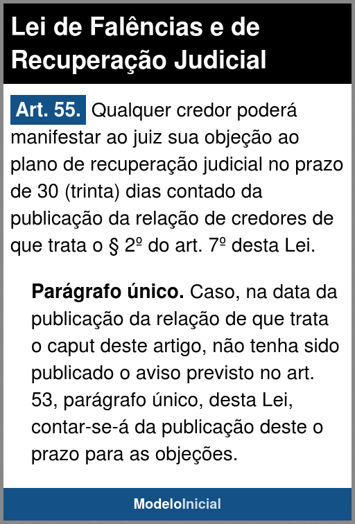 Art. 55. Qualquer credor poderá manifestar ao juiz sua objeção ao plano de recuperação judicial no prazo de 30 (trinta) dias contado da publicação da relação de credores de que trata o § 2º do art. 7º desta Lei.