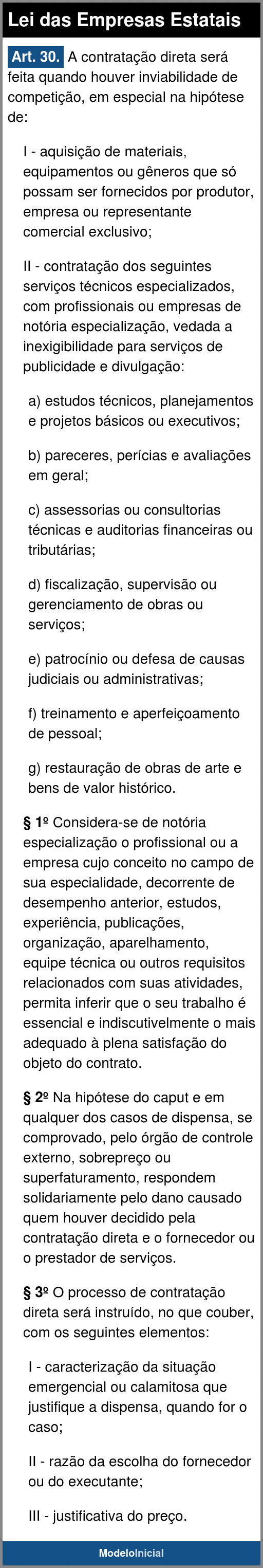 Art. 30. A contratação direta será feita quando houver inviabilidade de competição, em especial na hipótese de:
