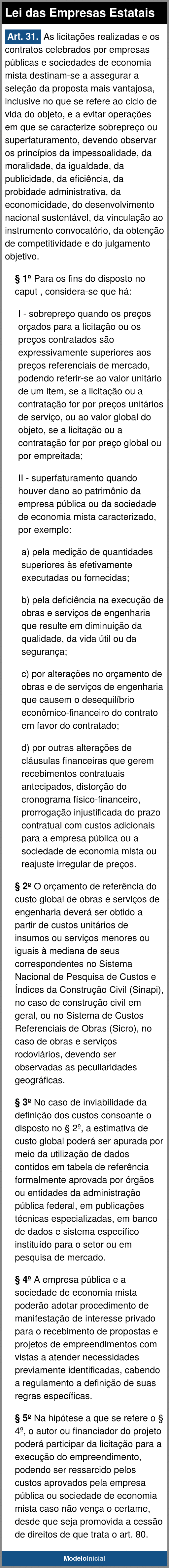 Art. 31. As licitações realizadas e os contratos celebrados por empresas públicas e sociedades de economia mista destinam-se a assegurar a seleção da proposta mais vantajosa, inclusive no que se refere ao ciclo de vida do objeto, e a evitar operações em que se caracterize sobrepreço ou superfaturamento, devendo observar os princípios da impessoalidade, da moralidade, da igualdade, da publicidade, da eficiência, da probidade administrativa, da economicidade, do desenvolvimento nacional sustentável, da vinculação ao instrumento convocatório, da obtenção de competitividade e do julgamento objetivo.