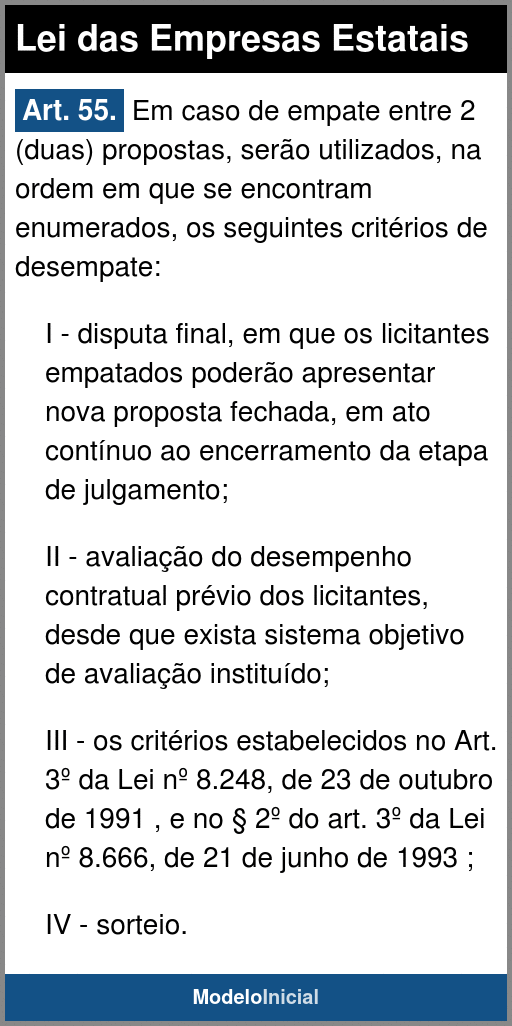Art. 55. Em caso de empate entre 2 (duas) propostas, serão utilizados, na ordem em que se encontram enumerados, os seguintes critérios de desempate: